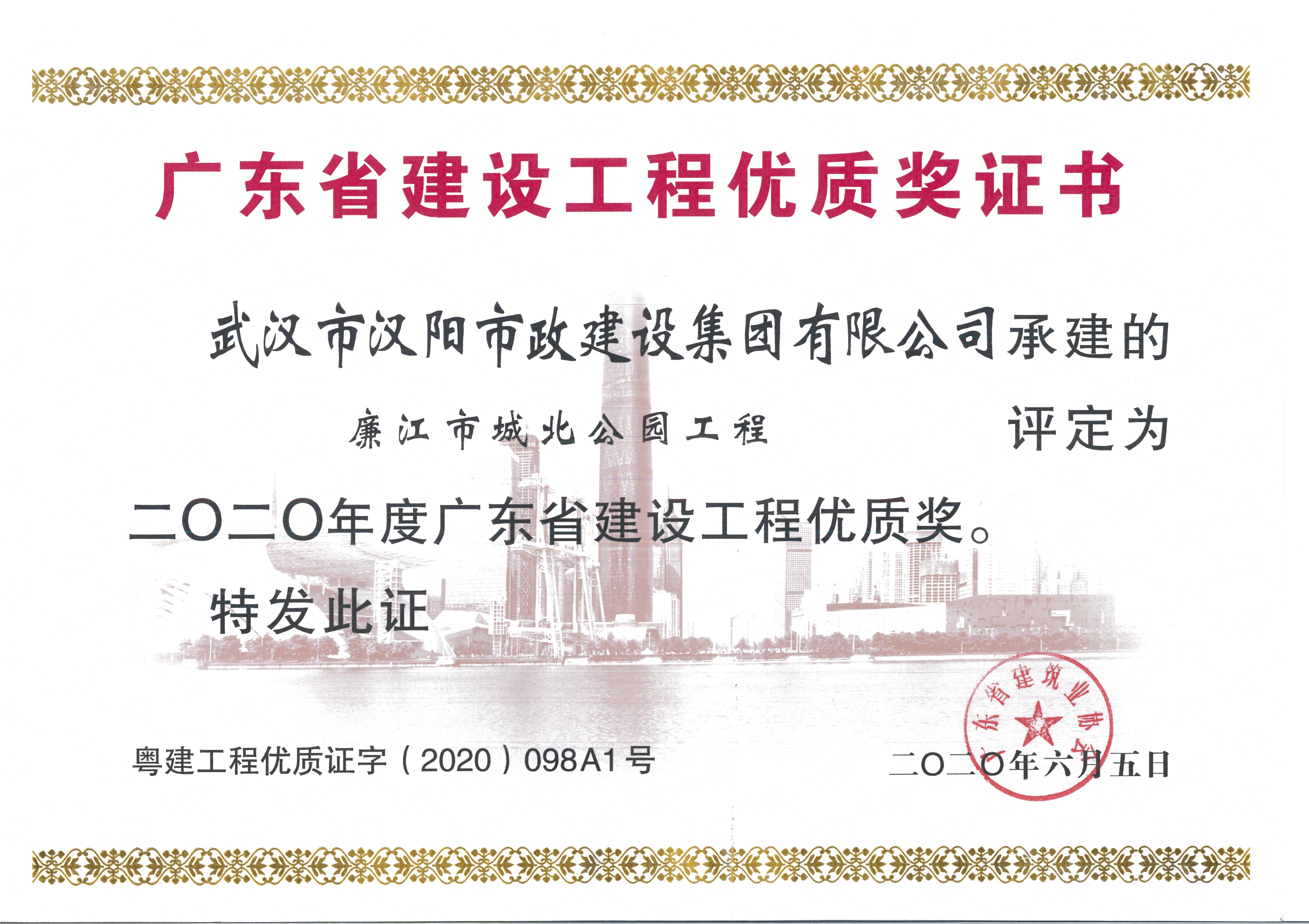 近日,廣東省建筑業協會公布了《2020年度廣東省建設工程優質獎名單》,由漢陽市政承建的廉江市城北公園工程,榮獲廣東省建設工程優質獎,此次獲獎是漢陽市政在省外獲得的最高工程獎項。