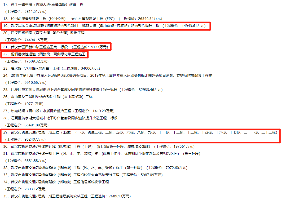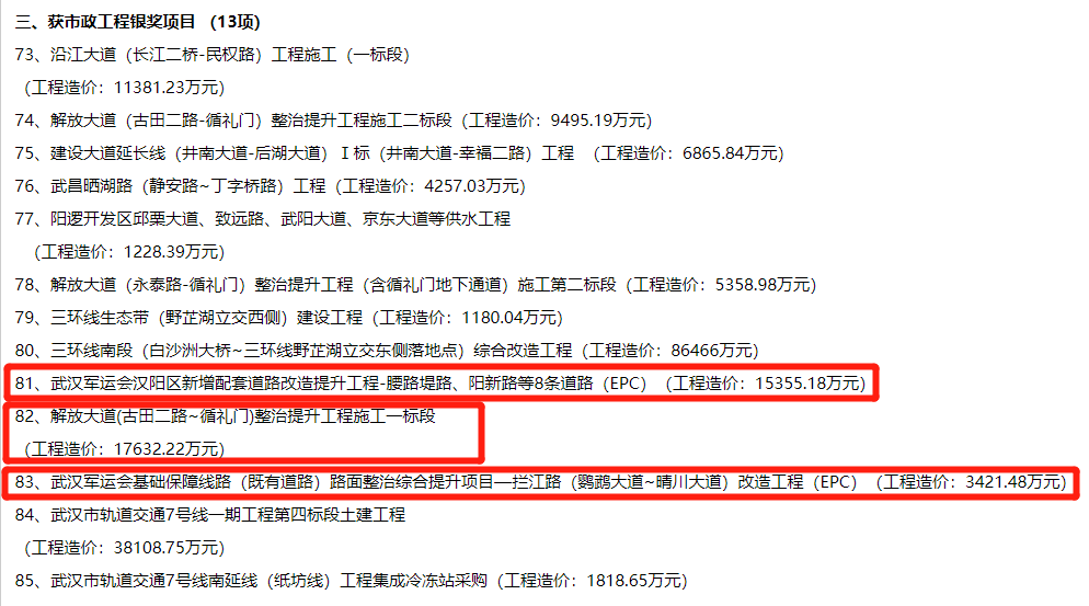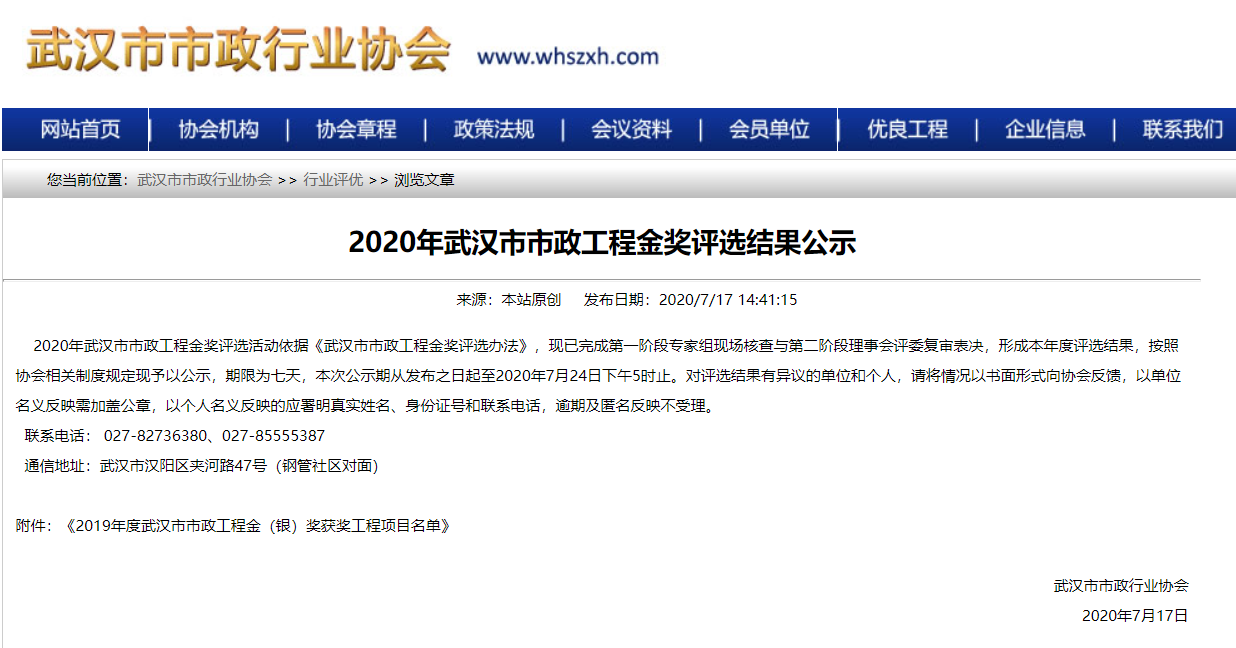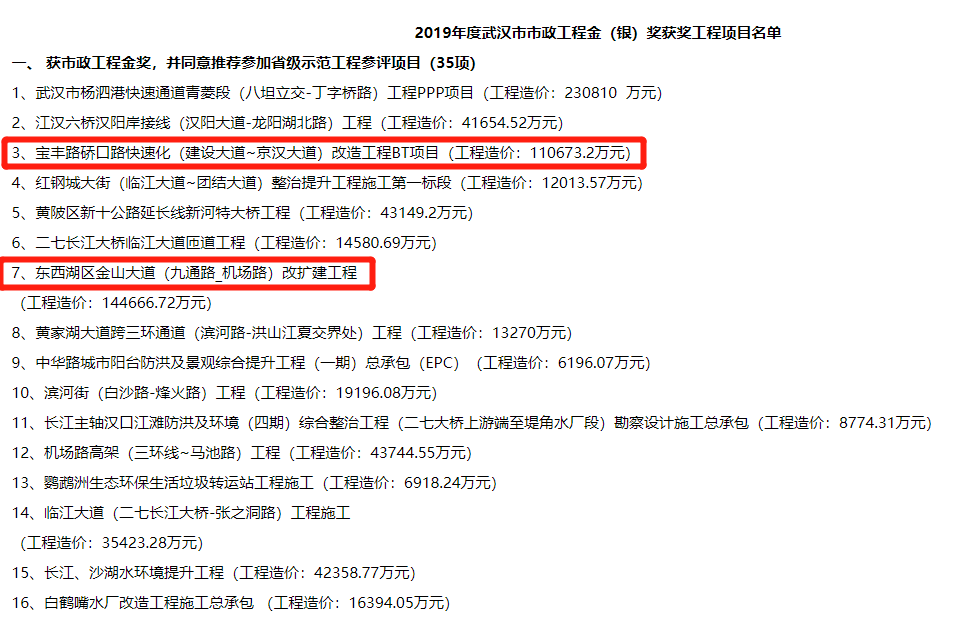 2019年武漢市市政工程金獎入選工程項(xiàng)目名單公示