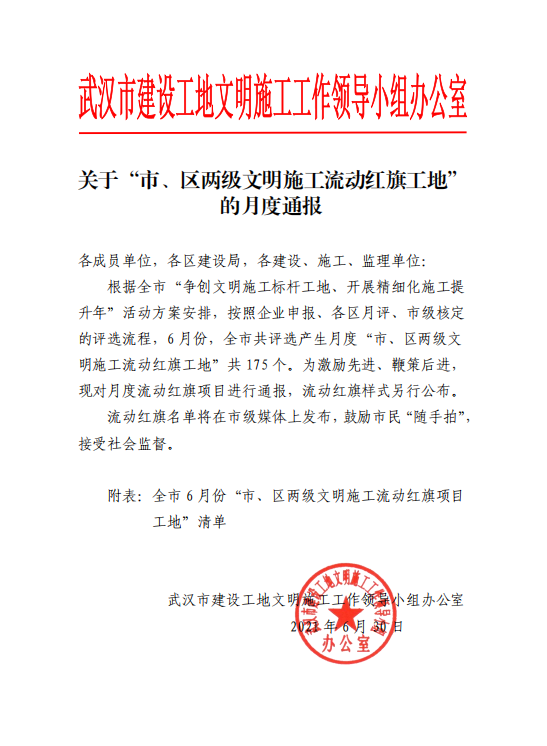 近日,武漢市建設(shè)工地文明施工工作領(lǐng)導(dǎo)小組辦公室發(fā)布了6月份關(guān)于“市、區(qū)兩級文明施工流動紅旗工地”的月度通報,漢陽市政及分子公司的8個項目獲評“流動紅旗工地”。