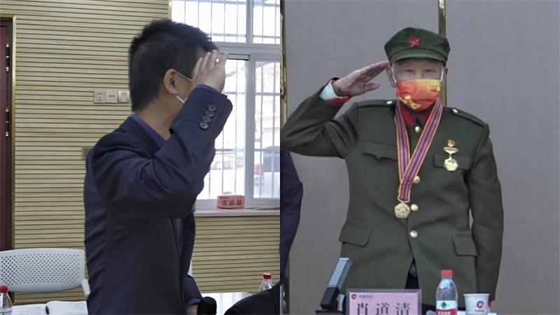在熱烈的掌聲中,肖道清深情地講起自己在抗美援朝前線作戰(zhàn)的經(jīng)歷。16歲的他積極響應(yīng)國家號召,從武漢奔赴東北,到有“人民空軍的搖籃”之稱的東北民主聯(lián)軍航空學(xué)校進行學(xué)習(xí),光榮地成為一名空軍塔臺的指揮員,與戰(zhàn)友跨過鴨綠江,一起爬冰臥雪、在零下三十多度的戰(zhàn)場上,枕戈待旦、奮勇搏殺。說到最后,肖道清激動地舉起手,敬了一個標準的軍禮。