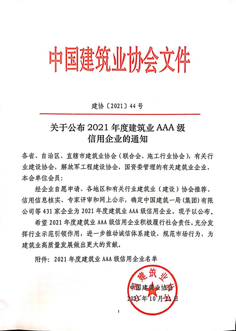 全國建筑業(yè)AAA級信用企業(yè)是以企業(yè)基本素質(zhì)、經(jīng)營能力、財務(wù)指標(biāo)、管理指標(biāo)、競爭力指標(biāo)、市場行為指標(biāo)等多項指標(biāo)進行綜合評估,評估總分90分(含)以上的企業(yè)入選AAA信用等級企業(yè)。并分為AAA、AA、A、B、C三等五級。AAA企業(yè)為信用企業(yè)的最高級,表示受信單位誠信度很高,各項指標(biāo)優(yōu)秀,企業(yè)素質(zhì)很高,誠信意識強、經(jīng)營狀況好、履約能力強、社會信譽好。