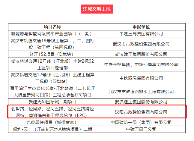 近日,由楚天都市報、武漢建筑業(yè)協(xié)會、武漢市建筑行業(yè)工會聯(lián)合會聯(lián)合主辦的2021年“創(chuàng)領智控杯”江城“雙十大”選樹結(jié)果揭曉,漢陽市政高新三路(三環(huán)線-外環(huán)線)改造提升工程總承包(EPC)獲評“江城十大智慧工地”,創(chuàng)智路、徑河路、徑河五路、徑河五路跨徑河橋、黃獅海東路工程總承包(EPC)獲評“江城文明工地”,武漢市軌道交通19號線工程第五標段土建工程獲評“江城優(yōu)秀智慧工地”。