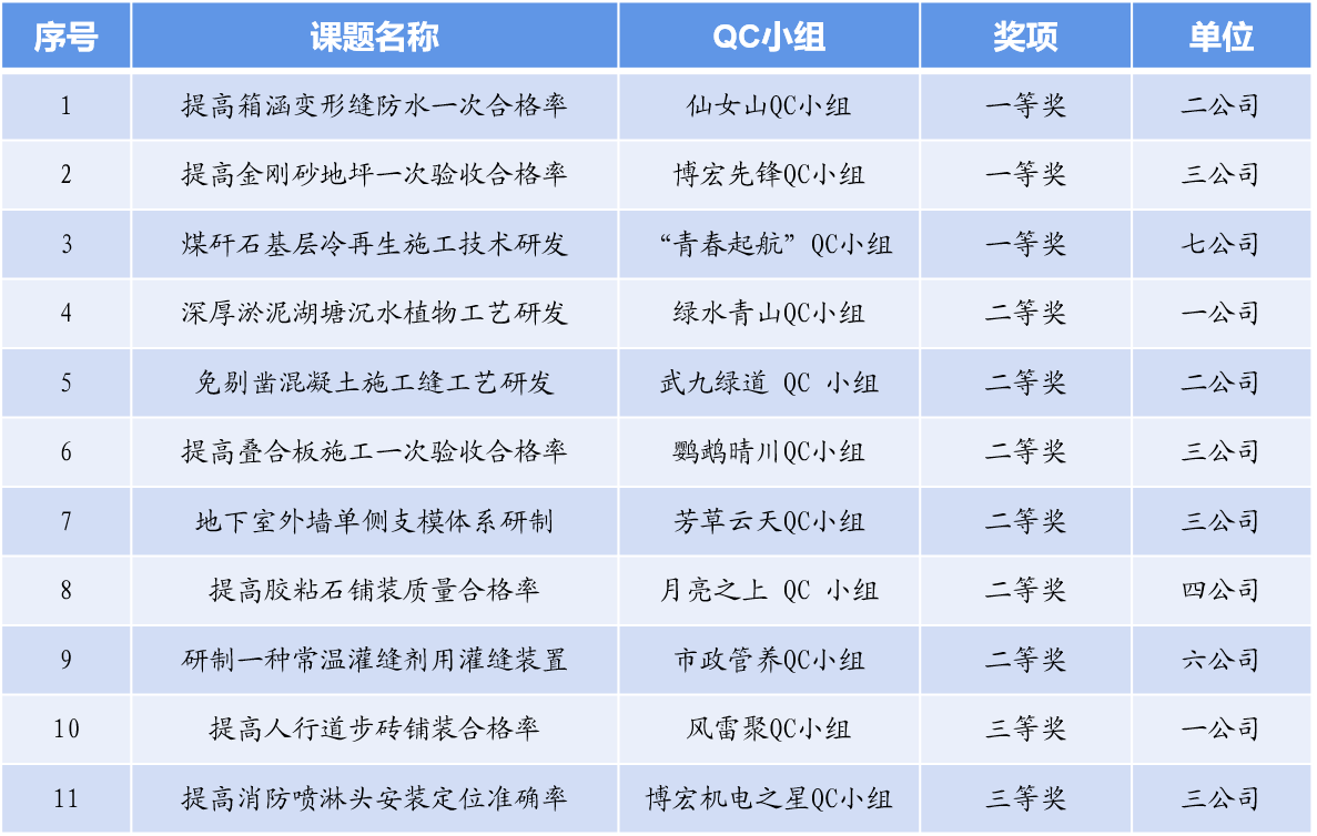近日,由中國施工企業(yè)管理協(xié)會(huì)主辦的2022年度工程建設(shè)質(zhì)量管理小組活動(dòng)復(fù)賽和決賽順利落幕,漢陽市政選送的11項(xiàng)優(yōu)秀QC成果在全國參賽成果中脫穎而出,均斬獲大獎(jiǎng)。其中3項(xiàng)成果榮獲一等獎(jiǎng),6項(xiàng)成果榮獲二等獎(jiǎng),2項(xiàng)成果獲三等獎(jiǎng)。這是公司首次獲得該類成果一等獎(jiǎng),標(biāo)志著工程質(zhì)量管理再上新臺(tái)階。