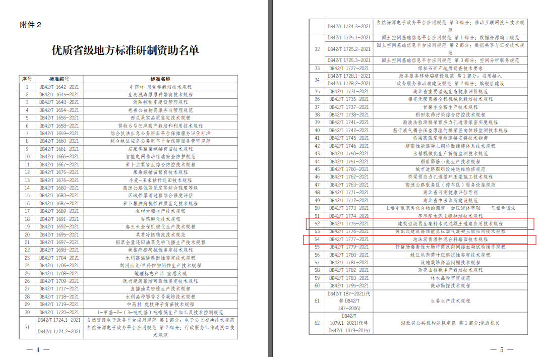 漢陽市政入選此次優(yōu)質(zhì)省地標(biāo)為(《建筑垃圾再生集料水泥混凝土道路應(yīng)用技術(shù)規(guī)程》DB42/T 1775-2021、《泡沫瀝青溫拌混合料路面技術(shù)規(guī)程》DB42/T 1777-2021),主要涉及混凝土和瀝青材料的推廣應(yīng)用,標(biāo)志著公司在垃圾資源化利用和泡沫瀝青的應(yīng)用推廣等方面得到行業(yè)認(rèn)可,達(dá)到省內(nèi)領(lǐng)先水平,具有較高的推廣應(yīng)用價值,為將來在道路工程的新材料與綠色技術(shù)的研發(fā)和推廣提供有力支撐。