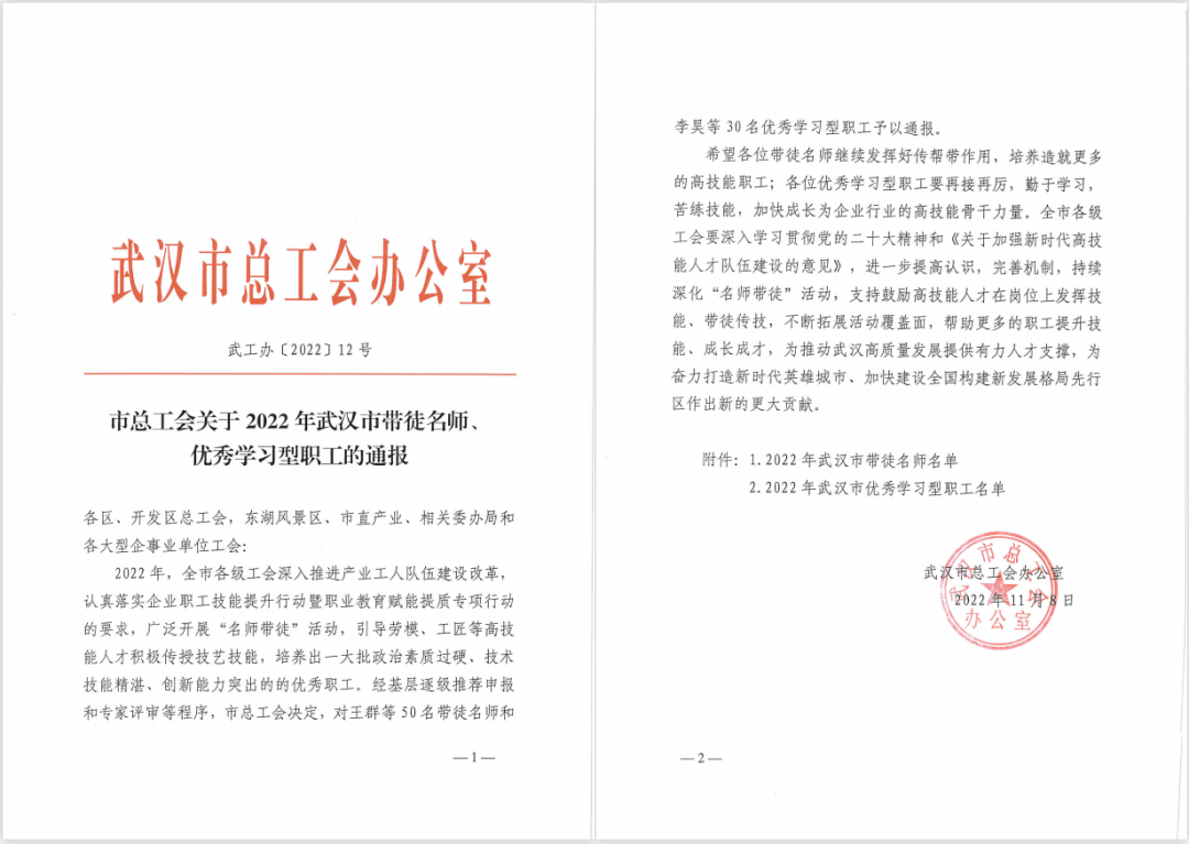 師徒結(jié)對傳匠心,青藍(lán)相接鑄輝煌。2022年11月8日,根據(jù)武漢市總工會辦公室發(fā)布的《市總工會關(guān)于2022年武漢市帶徒名師、優(yōu)秀學(xué)習(xí)型職工的通報》,漢陽市政羅明飛、李子豪、陳文獲評“武漢市帶徒名師”,林志剛、易曉輝獲評“武漢市優(yōu)秀學(xué)習(xí)型職工”。