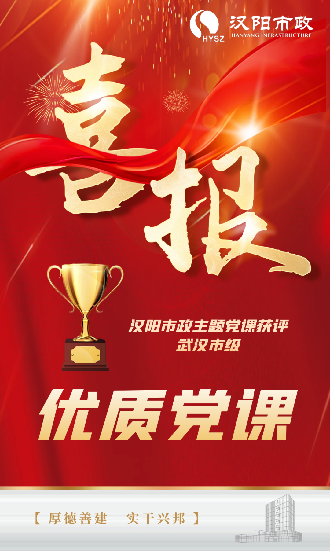 近日,武漢市委組織部發布了《關于2022年度全市“黨課開講啦”暨“主題黨課我來講”活動市級優質黨課的通報》,對50場市級優質黨課進行表彰。漢陽市政選送的《賡續紅色血脈 扛起時代擔當》在全市推薦申報的30200場黨課中脫穎而出,榮獲優質黨課優秀獎!