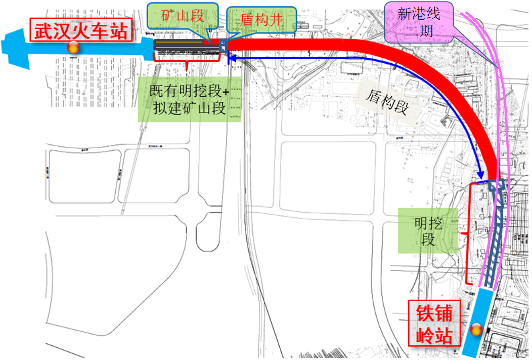 武漢市軌道交通新港線一期工程線路全長10.71km,共設站5座。其中新港線一標包含北洋橋站(明挖車站)、北洋橋站~武漢火車站(盾構及明挖區(qū)間)、武漢火車站(既有站內改造)、武漢火車站~鐵鋪嶺站(盾構及明挖區(qū)間)2站2區(qū)間。