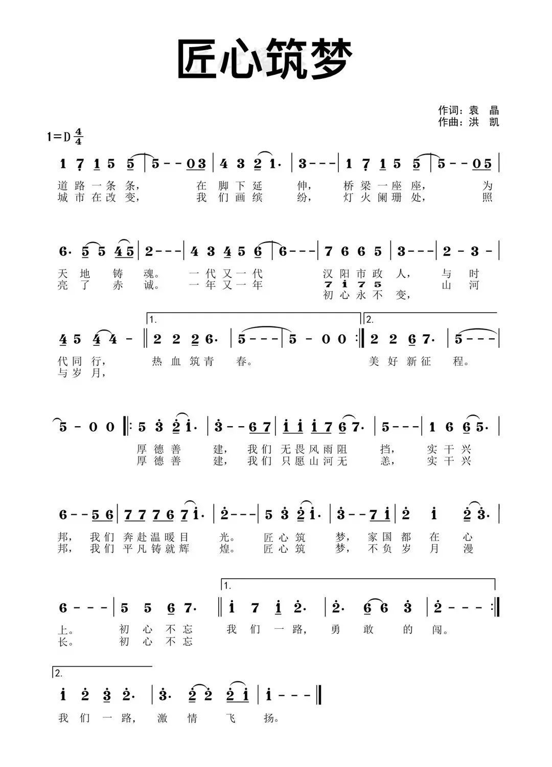 ? ?《匠心筑夢(mèng)》由袁晶作詞,洪凱作曲,節(jié)奏鏗鏘有力、雄壯昂揚(yáng),氣勢(shì)熱情澎湃、朝氣蓬勃。司歌承載著漢陽市政人為國(guó)為民盡心盡責(zé)的不變初心,唱響了新一代漢陽市政青年不負(fù)歲月用熱血繪就美好藍(lán)圖的壯志豪情。