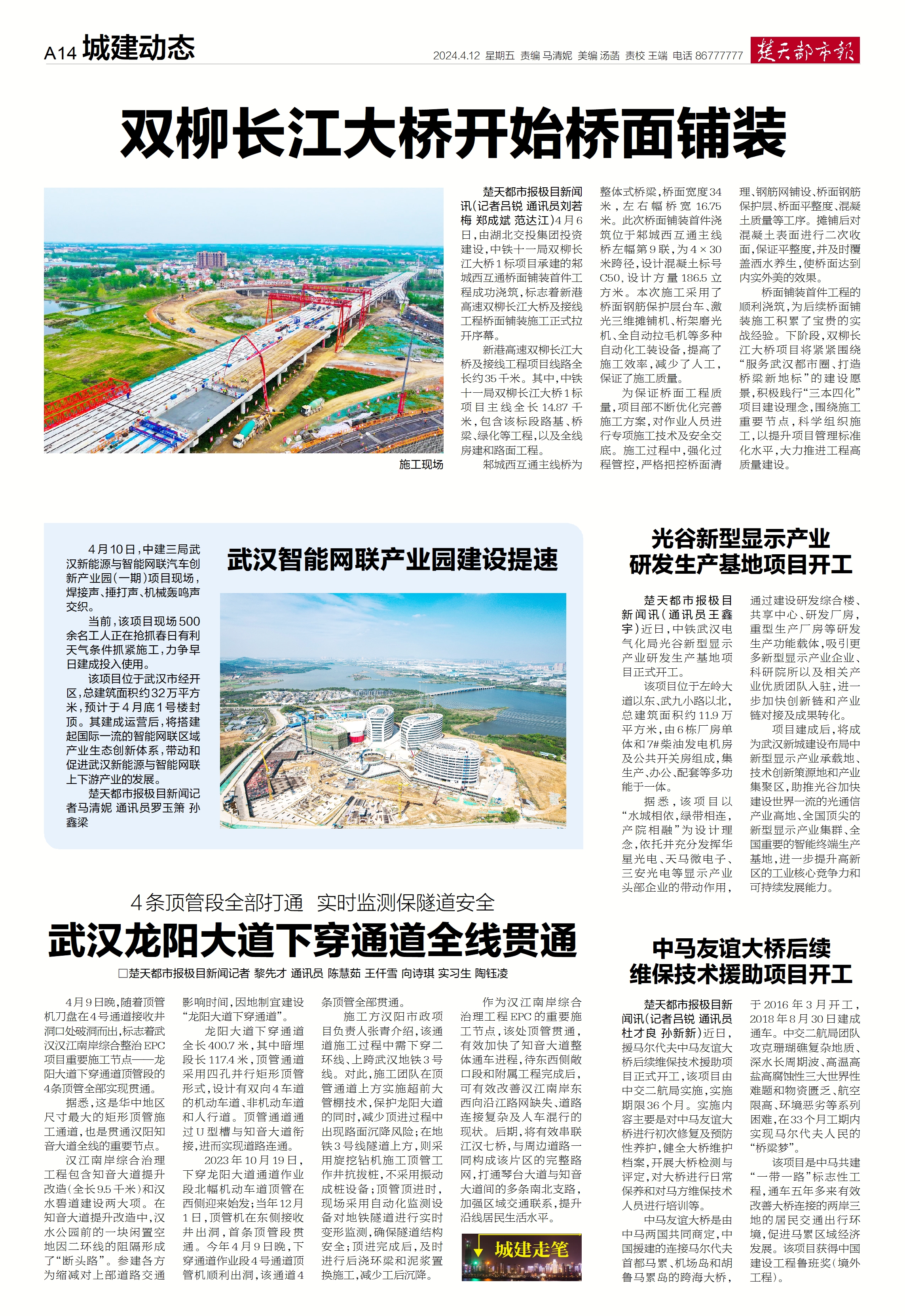 楚天都市報推出《雙柳長江大橋開始橋面鋪裝》專版報道。