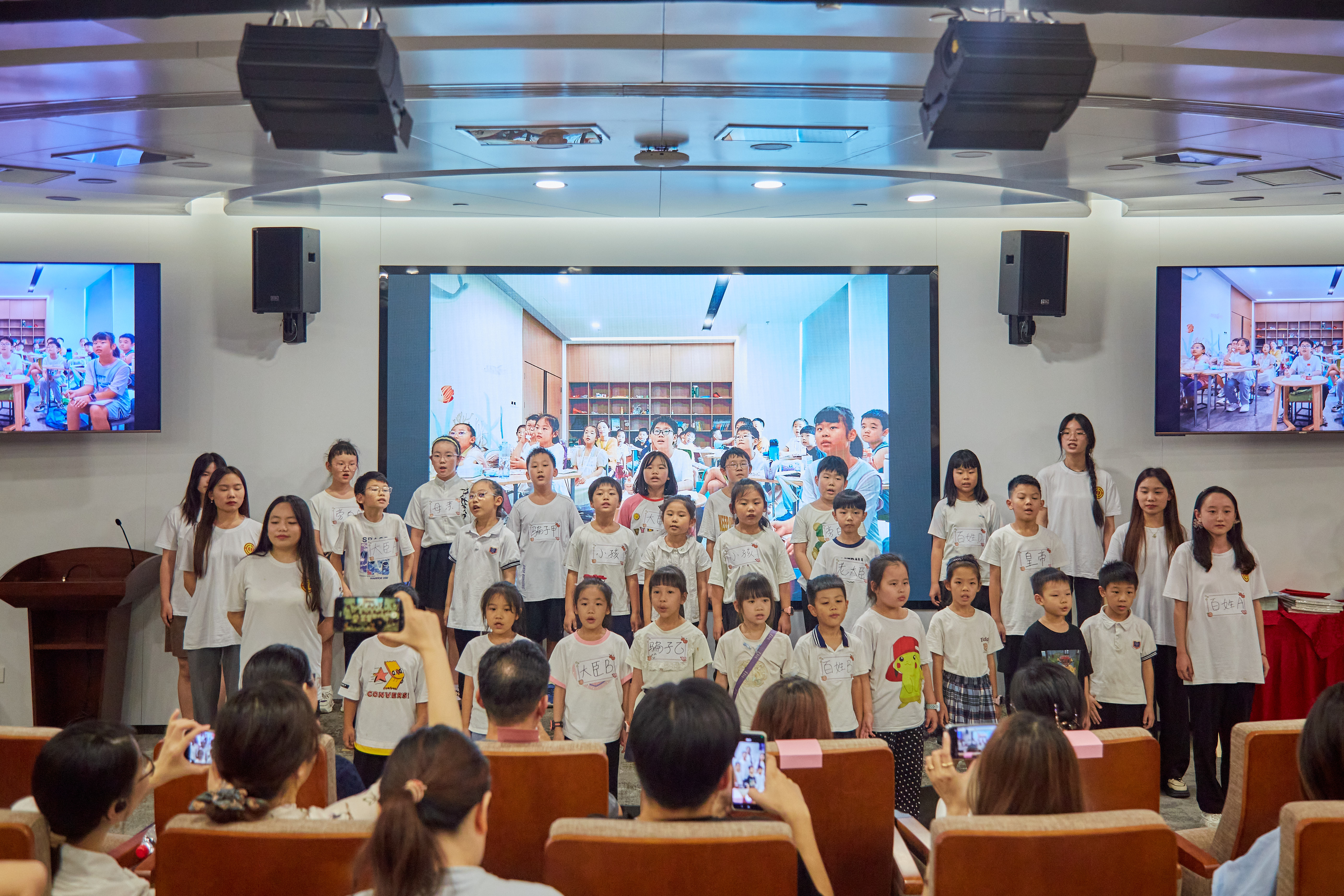 暖場視頻過后,托管班的“小小主持人們”引領(lǐng)大家走進(jìn)了精彩的節(jié)目表演環(huán)節(jié)。小朋友們精心準(zhǔn)備的歌舞串燒《上春山》、《勇氣大爆發(fā)》、《Do Re Mi》、朗誦節(jié)目《少年中國說》、舞臺劇《國王的新衣》以及大合唱《我不曾忘記》充滿活力與童趣,贏得了在場觀眾的掌聲和稱贊。